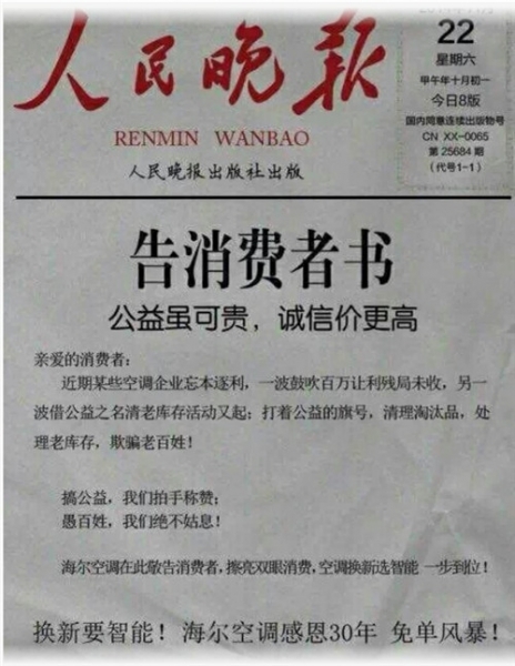海尔竟然冒充谁呢——人民晚报,伪造国家政府机关媒体,说我们这样的不对的。甚至我们在做活动的时候,说库存产品多了,我们不屑一顾。我们是负责任的,我们一定要坚持下去,所以我们一直坚持。
