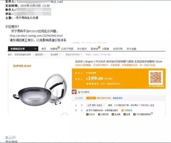 而今天再次被曝出的“投诉门”,从西门子换成了苏泊尔。京东向该家电供应商负责人称,苏宁易购平台FC32U5出现乱价问题,请协调回复正常价,以免影响渠道价格体系。