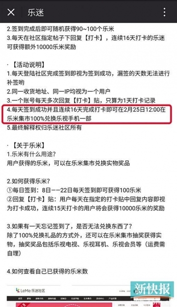 该推送文章中明确写道,每天签到成功并且连续16天完成打卡即可在2月25日12:00在乐米集市100%兑换乐视手机一部。同时全文未提及任何有关数量限制、限时抢兑等字眼。点击该文的“阅读原文”的选项,即跳转至上述“春节签到【打卡】帖”。