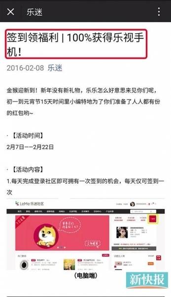 不过,新快报记者查证发现,微信官方认证主体为“乐视控股(北京)有限公司”的微信公众号曾在2月8日中午12时许推送一条名为“签到领福利丨100%获得乐视手机!”的文章,其内容与维权“乐迷”所提供的PC端原始活动规则帖截图一致。