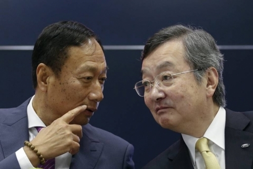 在收购签约仪式上的富士康CEO郭台铭与夏普社长高桥兴三