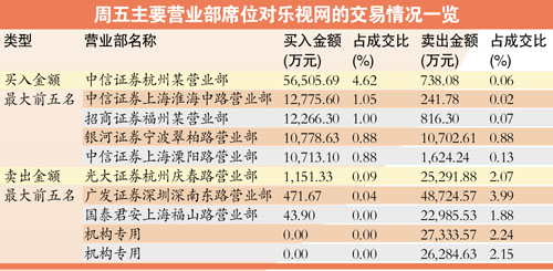 截至收盘,乐视网全天成交122.2亿元。而在深交所公布的龙虎榜中,卖方有两大“机构席位”,分别卖出2.73亿元和2.63亿元。广发证券深圳深南东路证券营业部卖出4.87亿元,占当天成交量的3.99%。