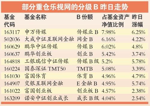 作为创业板第二大市值股,一季报显示,有120只基金持有乐视,其中,重仓持有乐视网的分级基金约有13只,这些基金持有乐视网的市值占基金资产净值比例均超过3%。昨日,一些重仓乐视网的基金大涨,传媒业B、传媒B级、E金融B分别上涨了6.25%、5.78%和5.74%。