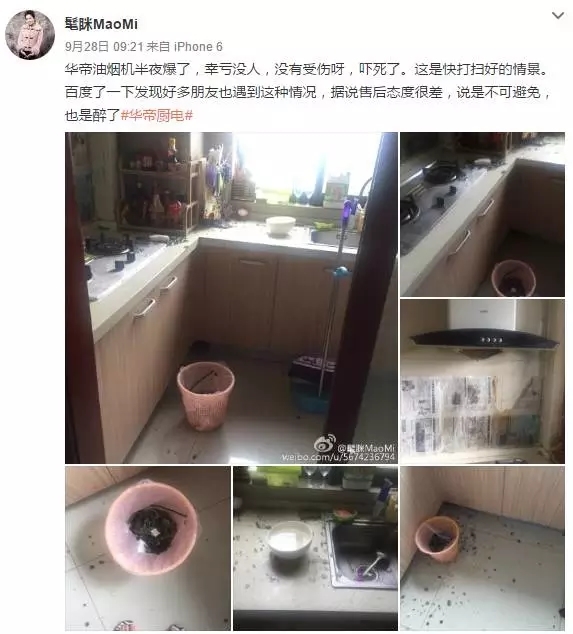 【家电网 HEA 2016年10月10日汇编】原本平静安宁的一个夜晚,被一声惊魂的爆裂声爆炸,醒来发现自己家里的油烟机爆炸了,换成是你还能安然入睡吗?反正微博网友@髦咪MaoMi是已经睡不着了。