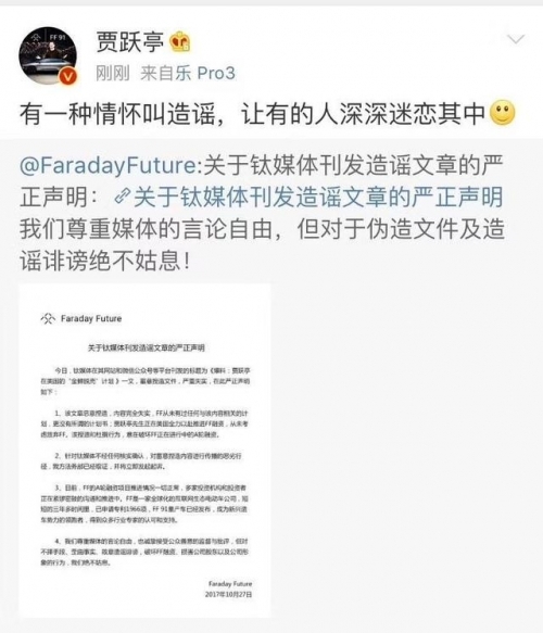 10月27日中午,法拉第未来官方微博发文回应称,“内容严重失实,贾跃亭先生正在美国全力推进FF融资,从未考虑放弃FF”并称“对于伪造文件及造谣诽谤绝不姑息。”
