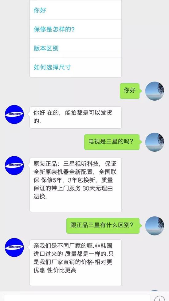 问到和正品三星的区别,店家回复称,和正品三星属于不同厂家,他们属于“非韩国进口”,但是“质量都是一样的”,只是他们是厂家直销的价格,因此相对更优惠,性价比更高。