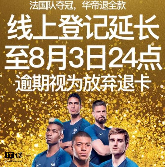 家电网-HEA.CN报道:根据华帝官方的消息,为了保证消费者的合法权益得到有效落实,考虑到部分消费者由于自身特殊原因,未能在原规定登记日期内前来办理“法国队夺冠,华帝退全款”登记手续,现特将“退全款”登记时间延长至8月3日24点止,请未登记的线上顾客抓紧时间联系所购华帝“夺冠套餐”店铺客服,逾期视为自动放弃权益,华帝股份将不接受登记处理,不再退卡。