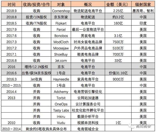 备注:沃尔玛2010年~2018年的收购、投资概览,由虎嗅·高街高参制图;表中收购的互联网技术企业主要用于沃尔玛电商平台的运营。