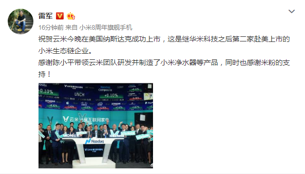 小米创始人雷军也在微博上祝贺云米成功上市,雷军称,这是继华米科技之后第二家赴美上市的小米生态链企业,感谢陈小平带领云米团队研发并制造了小米净水器等产品,同时也感谢米粉的支持!