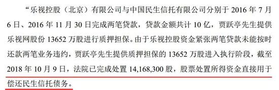 乐视控股(北京)有限公司与中国民生信托有限公司分别于2016年7月6日、2016年11月30日完成两笔贷款,贷款金额共计10亿,贾跃亭先生提供乐视网股份13652万股进行质押担保。