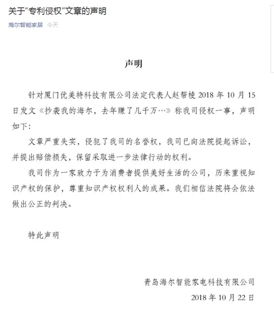 22日晚间消息,针对厦门优美特科技有限公司法定代表人赵帮枝2018年10月15日发文《抄袭我的海尔,去年賺了几千万...》称公司侵权一事 ,海尔智能家居发布声明回应称,文章严重失实, 侵犯了公司的名誉权, 已向法院提起诉讼, 并提出赔偿损失, 保留采取进一步法律行动的权利。