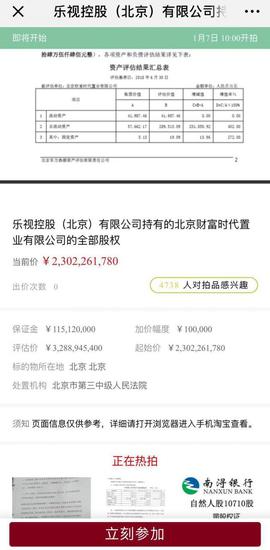 月初刚被融创等多家债主催讨几十亿负债,乐视控股资产再被拍卖。日前,阿里 拍卖平台挂出最新消息:受北京市第三中级人民法院委托,乐视控股旗下的北京财富时代置业有限公司的全部100%股权,将于2019年1月7日至1月7日开始拍卖,该资产的评估价为32.8亿余元,起拍价为23亿余元。12月20日,记者从阿里拍卖网页上看到,报名人数已多达4738人。标的物股价约为33.89亿元,起拍价23亿元,竞拍人需要缴纳1.1512亿元保证金。