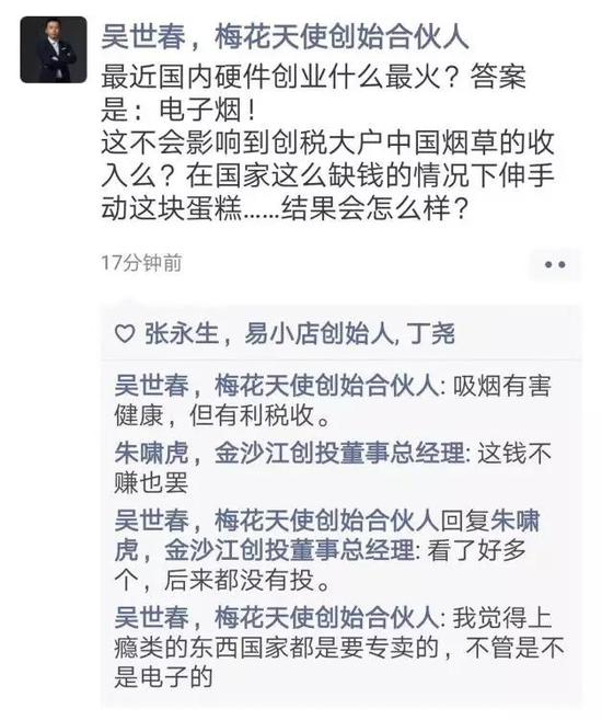 起因是近日梅花创投创始合伙人吴世春在朋友圈发文:最近国内硬件创业什么最火?答案是电子烟!这不会影响到创税大户中国烟草的收入?在特殊的情况下动这块蛋糕结果又会怎样?