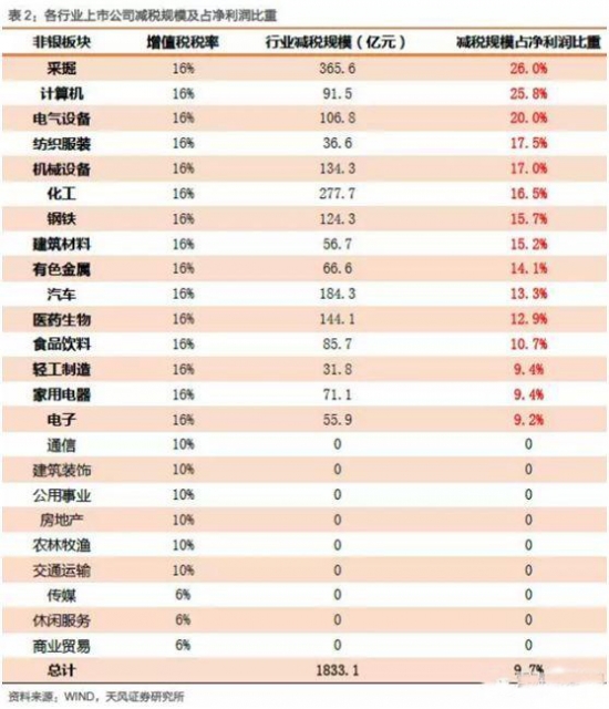 增值税率下调3个百分点,制造业将从中实现多大规模降本?天风证券数据显示,理论上最多可以减税6684亿元。参考2017年A股上市公司的财务数据,可以测算上市公司整体的静态减税规模。按照16%税档下调至13%的假设,各行业上市公司减税规模及占净利润比重如下: