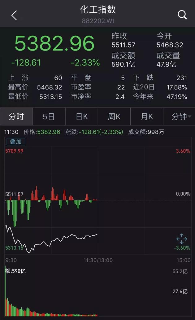 与家电板块的热火朝天不同,化工板块则一改前一交易日的火热行情,走势出现分化,申万化工指数领跌两市。龙头股浙江龙盛低开低走,最低下探至23.6元(跌6.72%),闰土股份最低下探至17.04元,(跌9.41%),主力资金出逃迹象明显。鲁西化工跌停、扬农化工触及跌停。