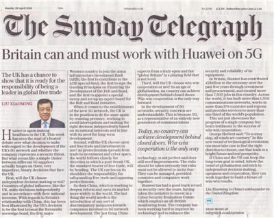 昨日,英国主流大报《星期日电讯报》纸质版和网络版刊登刘晓明大使署名文章《英国能够也应该与华为合作建设5G网络》,并在报纸头版头条配发专题导读文章。
