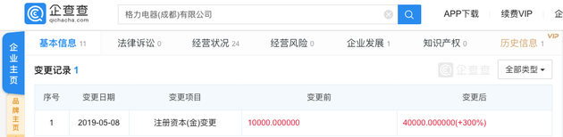 5月10日上午消息,企查查数据显示,5月8日,格力电器(成都)有限公司工商信息发生变更,注册资本由1亿变更为4亿,增加300%。