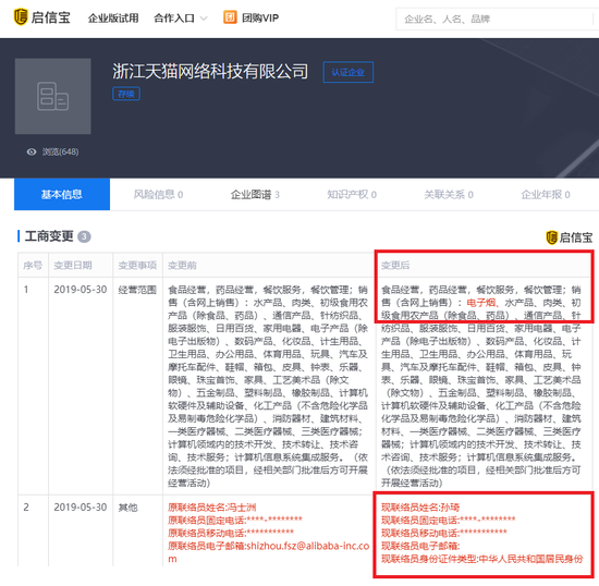 公开资料显示,浙江天猫网络科技有限公司由张勇担任法定代表人的浙江天猫技术有限公司百分百持股,于2019年1月24日成立,注册资本达8亿人民币,法定代表人为天猫超市总经理韩夏林。