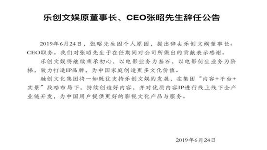 昨日,乐视影业(现更名为“乐创文娱”)官方公众号发布了乐创文娱原董事长、CEO张昭辞职的官方公告,乐创文娱方面向记者确认了张昭离职的消息。