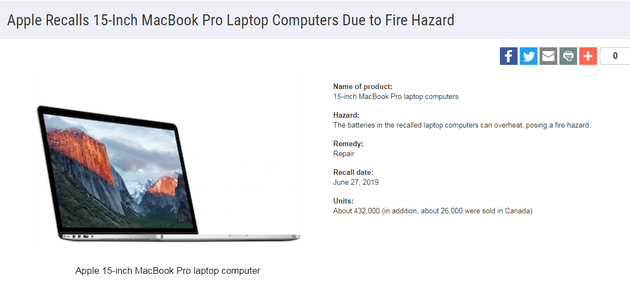 昨日晚间消息,美国消费品安全委员会(CPSC)称:苹果公司因火灾风险考虑,召回了43.2万台15英寸Mac Pro 笔记本电脑。