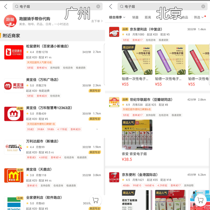 笔者也随即打开美团外卖搜索相关关键词,发现如果是定位在广州,是无法搜出相关结果,但当我选择定位为北京时,则是搜出非常多的结果,出售的电子烟品牌不一,而且令我比较担心的是,多家便利店电子烟的详情页中并无详细说明,也就是说这些电子烟可能来路不明。