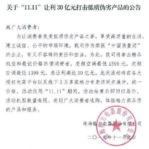 11月9日,格力电器发布公告称,将让利30亿元,用精品机型和最优价格回馈消费者,变频空调最低1599元,定频空调最低1399元。此次活动线上线下同步进行,渠道涵盖格力各大授权电商平台、各区域商家、格力员工的微店及线下3万多家格力专卖店。