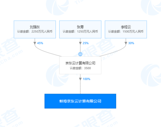 天眼查数据显示,近日,蚌埠京东云计算有限公司成立,注册资本3500万元,法定代表人为京东云与AI事业部华东区总经理赵彬,由京东云计算有限公司全资控股,后者的第一大股东为刘强东,持股比例为45%。