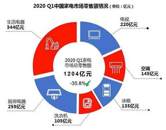 近日,中国电子信息产业发展研究院发布了《2020年第一季度中国家电市场报告》(以下简称《报告》)。《报告》显示,2020年第一季度,我国家电市场在抗击新冠肺炎疫情中奋力前行,零售额规模达1204亿元,同比下降35.8%。