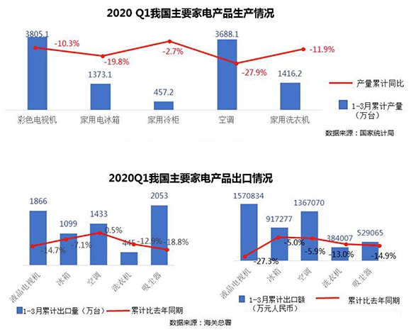 根据《报告》显示,2020 Q1主要家电产品生产方面,彩电-10.3%、家用冰箱-19.8%、家用冷柜-2.7%、空调-27.9%、家用洗衣机-11.9%。主流家电产品都出现不同程度的下滑,特别是需要上门安装的空调产品,受疫情封城影响,降幅最大。