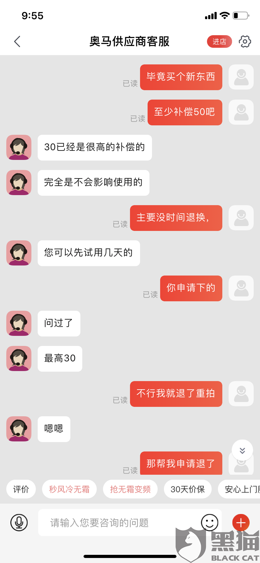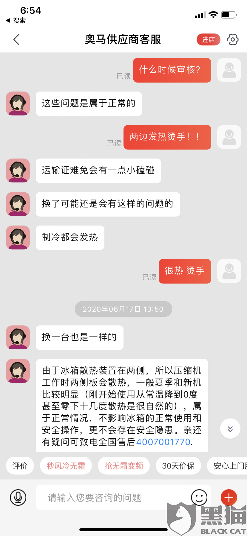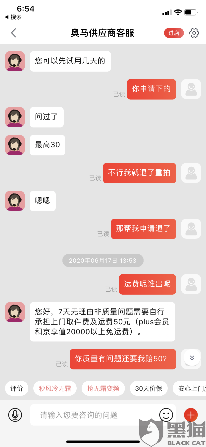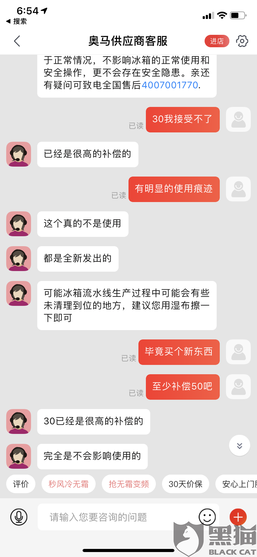 消费者“匿名”在6月22日向黑猫投诉平台反映:“收到商品质量有问题,后面有压痕,密封条变形,内部明显又使用痕迹,二手商品,找客服换货,检测人员上门检测说不影响正常使用,说再换一台也是这样,让找客服协商,一开始说可以补偿30元,我不接受,并要求至少补偿50元,不然就退货。客服找他们售后说可以补偿,我就同意了。没想到最后返款只是返30元,再次找客服,客服就反口了,看不到聊天记录,各种让截图,说只能返30元,第一次遇到这么恶心的商家!!!”