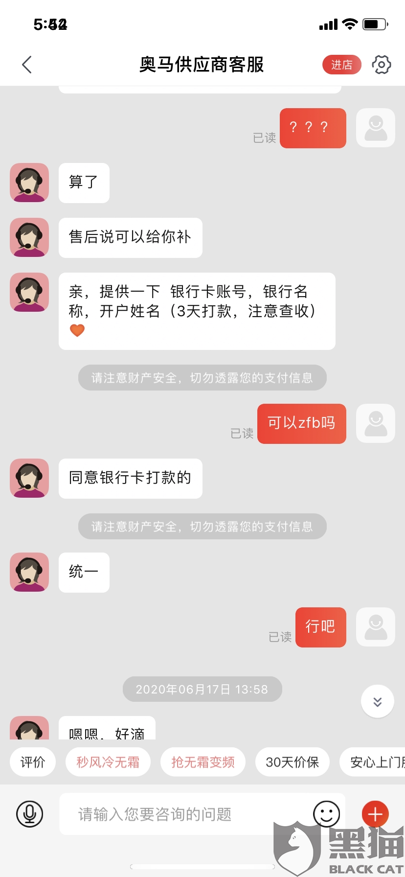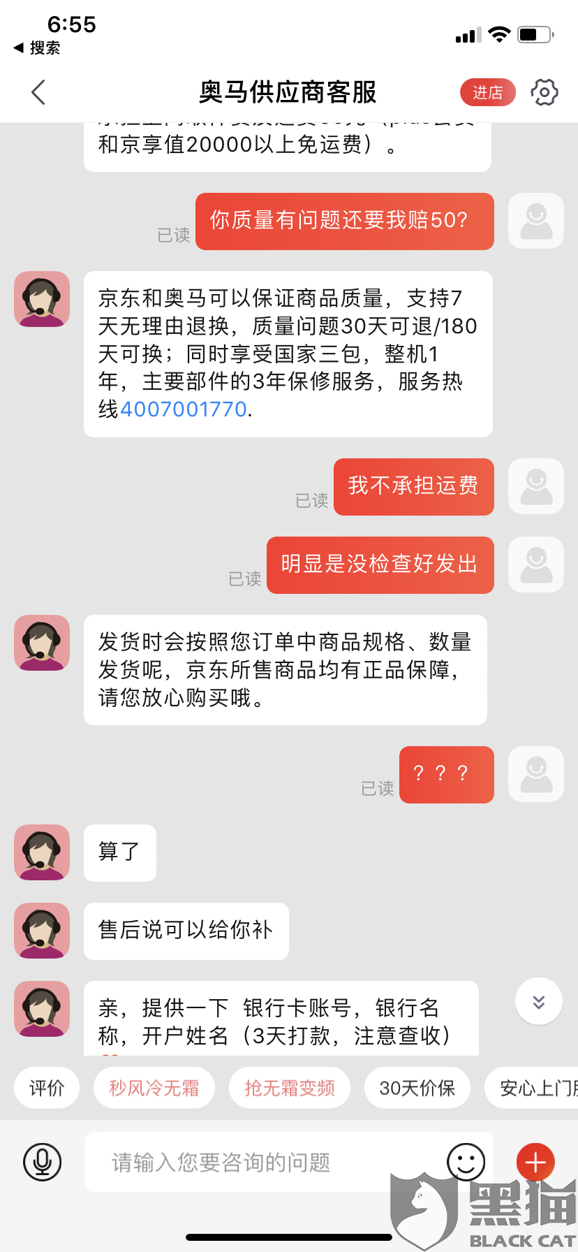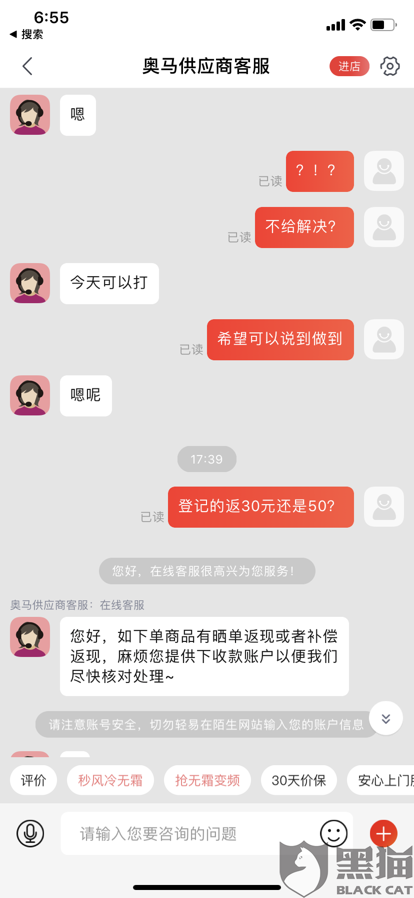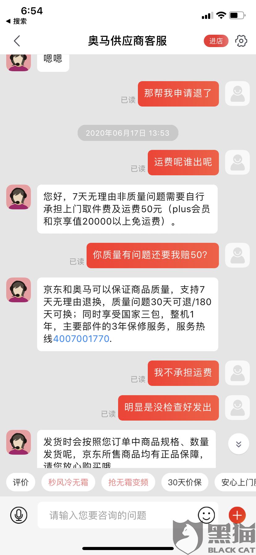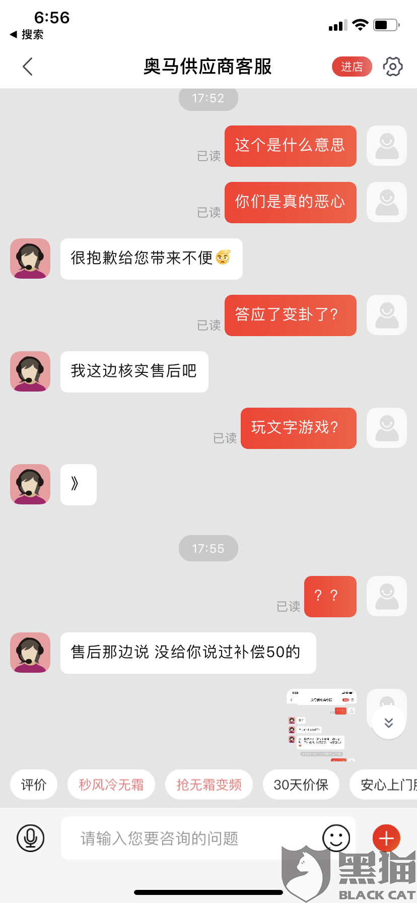 消费者“匿名”在6月22日向黑猫投诉平台反映:“收到商品质量有问题,后面有压痕,密封条变形,内部明显又使用痕迹,二手商品,找客服换货,检测人员上门检测说不影响正常使用,说再换一台也是这样,让找客服协商,一开始说可以补偿30元,我不接受,并要求至少补偿50元,不然就退货。客服找他们售后说可以补偿,我就同意了。没想到最后返款只是返30元,再次找客服,客服就反口了,看不到聊天记录,各种让截图,说只能返30元,第一次遇到这么恶心的商家!!!”