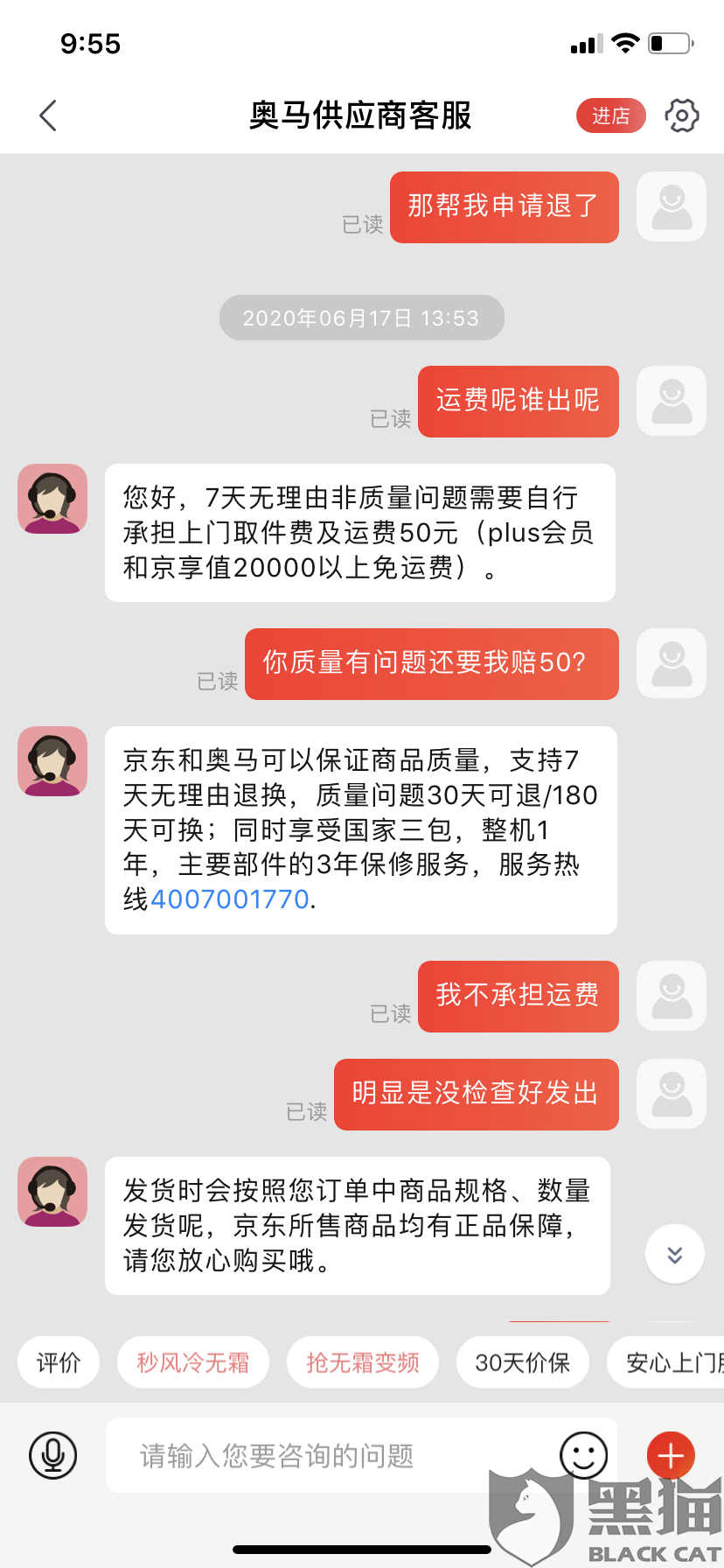 消费者“匿名”在6月22日向黑猫投诉平台再次反映:“6月17号收到商品质量有问题,后面压了一个小坑,密封条变形,内部藏擦拭不掉,有使用过的痕迹,明显瑕疵残次品,当天找客服换货,说要上门检测,18号有工作人员上门检测拍照说不影响正常使用,说再换一台也是这样,让找京东线上客服协商,当天下午找客服说不影响正常使用可以补偿30元,个人不接受并要求换货,客服说要检测文件才能换,支持退货自行承担运费,质量问题还要买家承担?由于要上班没时间折腾,愿意退一步提出补偿50元可以不退还,不然就退货,客服后面回复说售后同事说可以补偿,我就同意了,没想到22号下午只收到30元的补偿,再次找客服就反口变卦了,表示没答应过,为了20元玩文字游戏??欺骗消费者??那么大一个品牌欺骗消费者做起来的???客服独吞20元???第一次遇到这么恶心的京东自营商家!!!”