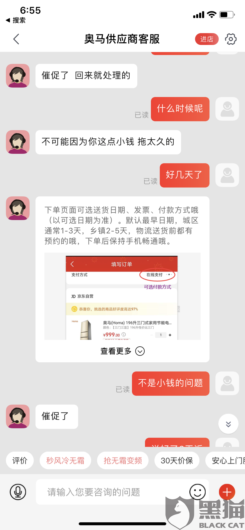 投诉详情:奥马冰箱京东自营旗舰店不良商家欺骗消费者