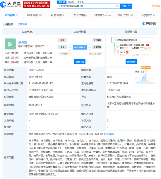 天眼查数据显示,北京锤子数码科技有限公司成立于2014年6月,注册资本2000万人民币,法定代表人为温洪喜,公司经营范围包括销售通讯设备(需行政许可项目除外)、软件及辅助设备;货物进出口、技术进出口、代理进出口;委托加工电子产品等,由锤子科技(北京)股份有限公司全资控股。