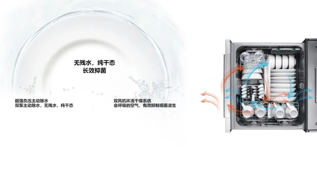 所谓“干态”,顾名思义,就是在洗碗机内部打造干燥干爽的餐具储存环境,避免大量积水,从而杜绝细菌滋生。对此,市面上大部分洗碗机采用的都是被动的余热烘干方式,而华帝干态抑菌洗碗机则采用了主动干燥技术:一方面在技术层面通过升级双泵巡航排水,七天循环,同时搭载双风机呼吸系统设计,新风干燥换气,实现双效合一;另一方面在内部材质上采用不锈钢精细滤网,防止二次污染更耐用,从而确保清洁后的洗碗机内部可保证无论是碗碟、内壁还是底部、排水柱都保持干燥,真正实现无残水、纯干态、长效抑菌的体验升级。