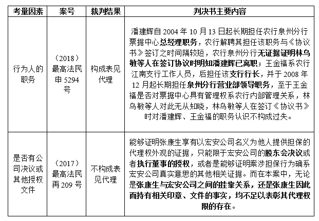 针对上述三个方面,司法判例中具体审查的因素主要包括:1)行为人的职务;2)行为人是否有公司决议或者其他授权文件证明;3)双方的交易历史;4)相对人的专业判断能力;5)被代理人是否明知或应知伪造公章的行为,且是否采取补救措施等。相关司法裁判观点汇总如下: