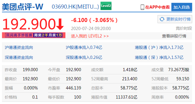 家电网-HEA.CN报道:7月24日上午消息,港股恒生指数开跌0.88%,科技股普遍下跌。腾讯 跌2.69%报542.00港元,阿里巴巴 跌0.97报244.20港元,美团点评跌3.06%报192.90港元,京东 集团跌2.73报245.00港元,网易跌2.74%报141.70港元,小米集团跌3.01%报15.46港元。