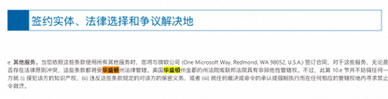 「当您依照这些条款使用所有其他服务时,您将与微软公司 (One Microsoft Way, Redmond, WA 98052, U.S.A.) 签订合同,对于这些服务,无论是否存在法律原则冲突,这些条款都将受华盛顿州法律管辖。美国华盛顿州金郡的州法院或联邦法院具有非排他性管辖权」。