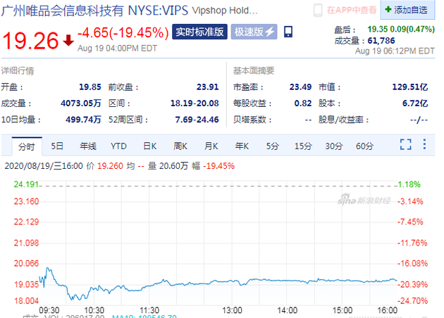 北京时间8月20日消息,唯品会 CFO杨东皓在第二季度财报中宣布辞职,周三收盘,唯品会股价大跌19.45%,报19.26美元,当前市值为129.51亿美元。