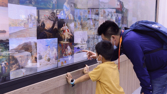 京东方8K百变屏展示着文物藏品和书画佳作,参观者根据个人爱好触摸点击屏幕,查看文物介绍,在展会现场吸引人们纷纷驻足体验。