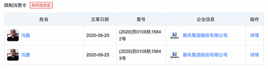 据天眼查App显示,9月22日,暴风集团股份有限公司及法定代表人冯鑫一日连收两封北京市海淀区人民法院下发的限制消费令,立案执行申请人均为北京应诺维新文化传播有限公司,因未按执行通知书指定的期间履行生效法律文书确定的给付义务。
