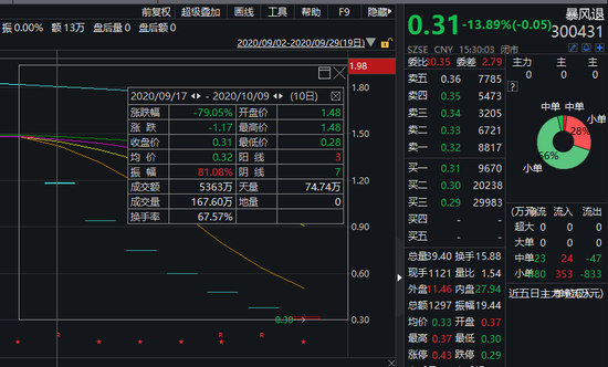 而进入退市整理期之后,暴风集团的股价更是连续6个20%跌停,最新数据显示,暴风退10月9日跌13.89%,股价跌至0.31元,总市值仅剩1亿元,据退市前的4.88亿市值,继续跌了80%;据最高市值408亿元,下跌了99.7%。