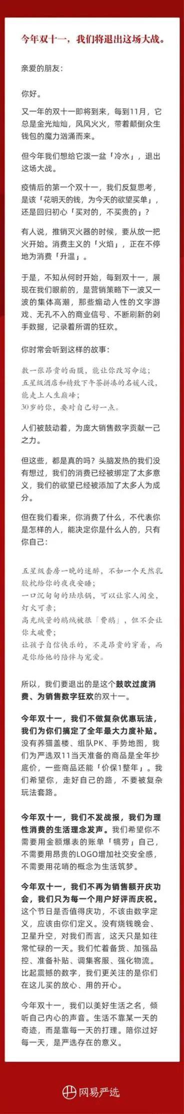 2020年11月4日,网易严选官方宣布退出双十一大战。