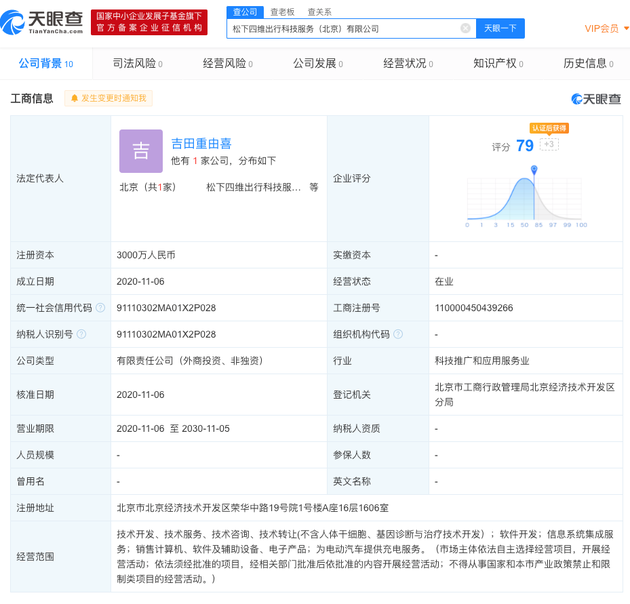 天眼查App显示,11月6日,松下四维出行科技服务(北京)有限公司成立。该公司注册资本3000万人民币,法定代表人为吉田重由喜,经营范围包含销售计算机、软件及辅助设备、电子产品;为电动汽车提供充电服务等。