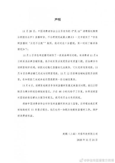 11月21日,针对中国消费者协会发布的“双11”消费维权舆情分析报告中案例:李佳琦直播间“买完不让换”,@李佳琦直播官方微博 回应称,顾客曾在11月6日将问题反映给品牌方和李佳琦直播间,厂商因为当时货品已售完无法换货,进行了退款,直播间一直与品牌方积极协调做好售后。如果对目前的售后解决方案仍有意见,会负责到底。