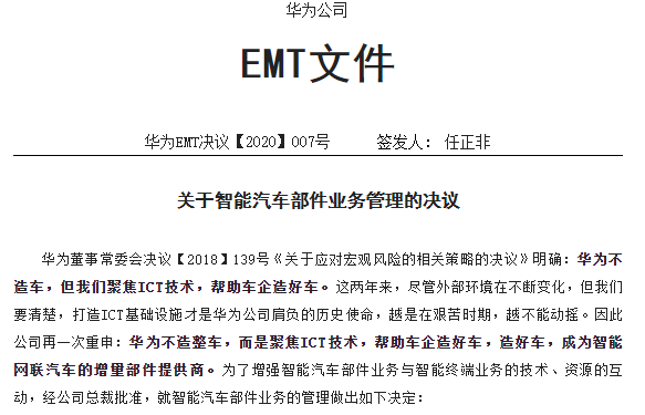 11月25日,华为心声社区今日刊出华为经营管理团队(EMT)文件,其中再次重申,华为不造整车,而是聚焦ICT技术,帮助车企造好车,造好车,成为智能网联汽车的增量部件提供商。