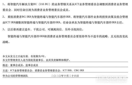 “以后谁再建言造车,干扰公司,可调离岗位,另外寻找岗位。智能终端与智能汽车部件IRB和消费者业务管理委员会要坚持华为不造车的战略,且无权改变此战略。”