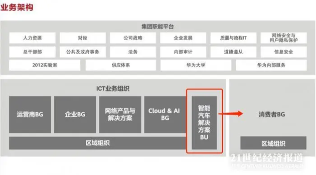 原本在企业中,BU原本是指产品线,BG是事业群,按理说BG层级更高。但是,当时华为将汽车BU移至集团下,隶属于ICT组织,与BG在同一排位,汽车业务的重要性可见一斑。现在,汽车从面向B端的ICT业务中剥离,调至服务C端的消费者业务板块。