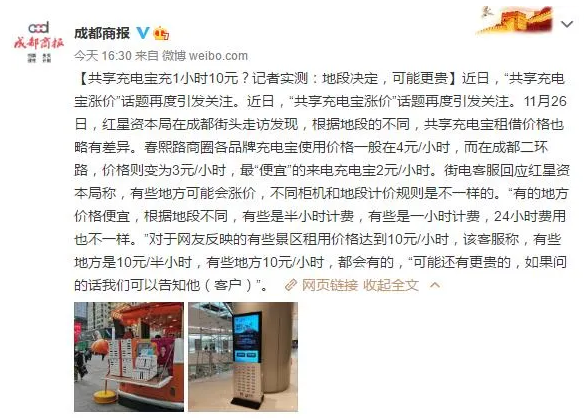 据成都商报报道称,街电方面称共享充电宝“有些地方是10元/半小时,有些地方10元/小时,可能还有更贵的”。