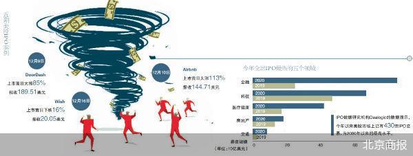 上市就是暴涨,这仿佛是当时传递出的最直接的信号。数据显示,仅12月9日-11日,美股就有9家企业上市,其中便包含爱彼迎和DoorDash,而据IPO数据研究机构Dealogic数据显示,截至目前,今年以来美股市场上已有430宗IPO交易,为2000年以来的最高水平;募资规模已经超过1600亿美元,创历史新高。